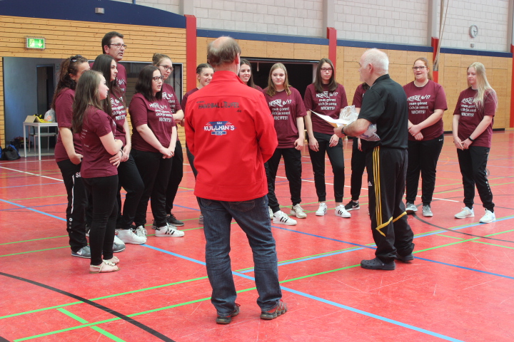 Vor Beginn des letzten Heimspiels der Damenmannschaft des 1.FCK am 30. April 2017 begrüßte Abteilungsleiter Rudi Scholl die Meistermannschaften der männlichen D- sowie der weiblichen D- und B-Jugend der Saison 2016/17.